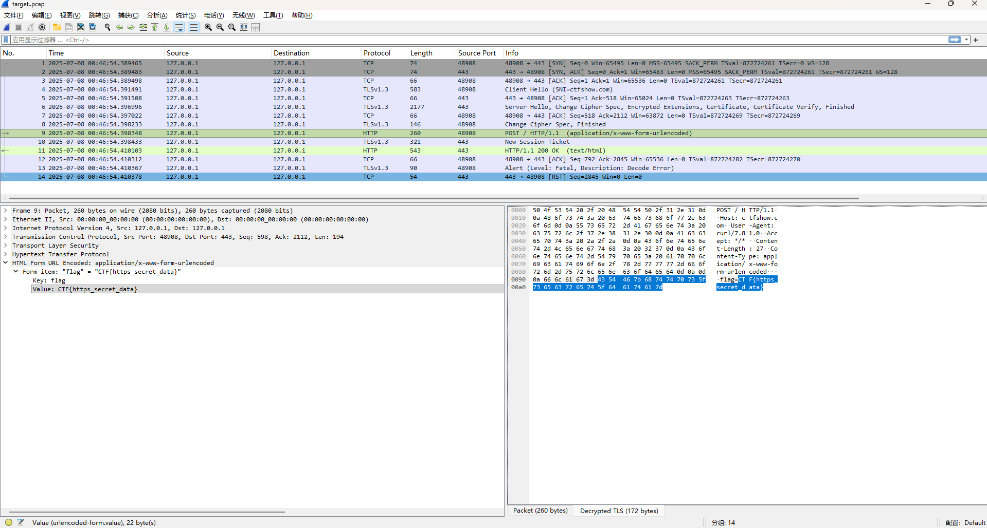 target.pcap是Wireshark的流量包文件,而sslkey.log则是密钥日志文件,使用Wireshark加载流量包