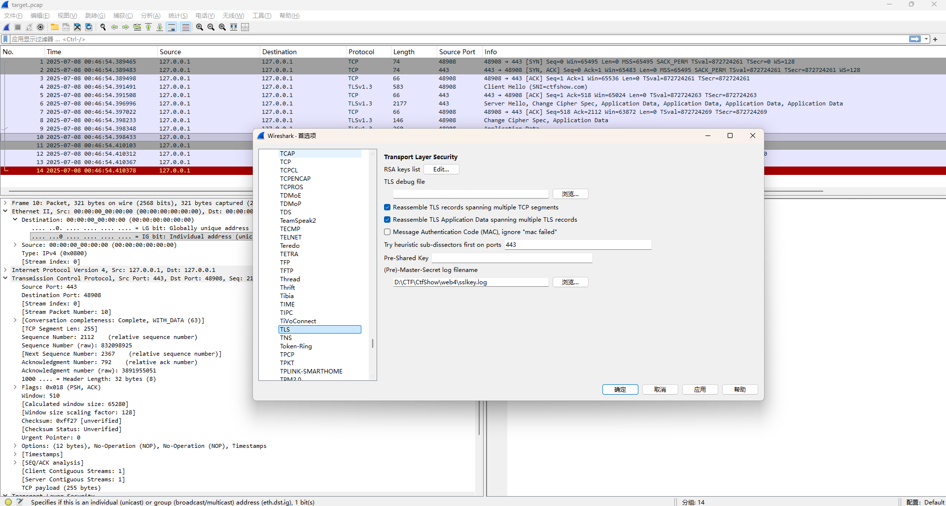 打开Wireshark,依次点击:编辑 -> 首选项 -> Protocols,找到TLS选项,在 "(Pre)-Master-Secret log filename" 中导入获得的密钥