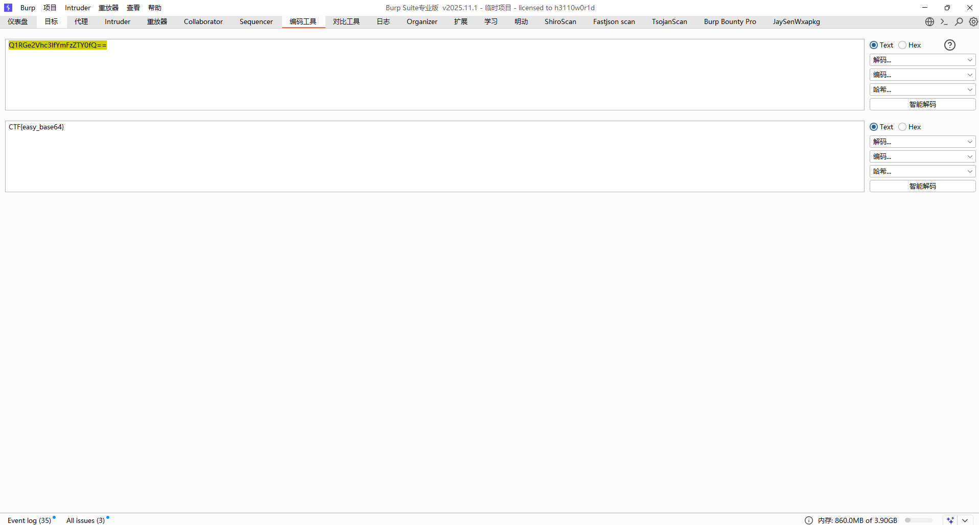 初步判断是Base64编码,使用Burp进行解码,结果是 "CTF{easy_base64}",这是密码;