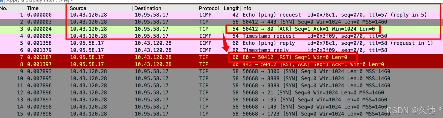 前 4 个请求并不需要每个都有回应,任意 1个回应即可判定主机存活 (如下图可以看到目标回应ACK 1 个RST)
