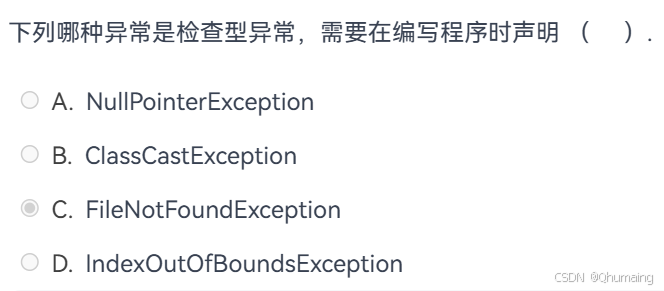 空指、转类型、索引越界、除零错 → 都是运行时异常(非检查型),不用处理;