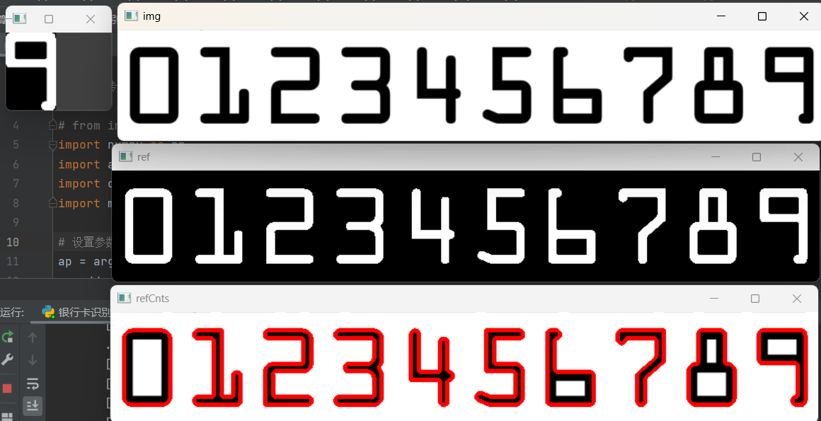 ref = cv2.threshold(ref, 10, 255, cv2.THRESH_BINARY_INV)[1] # 二值图像 黑底白字,方便找轮廓