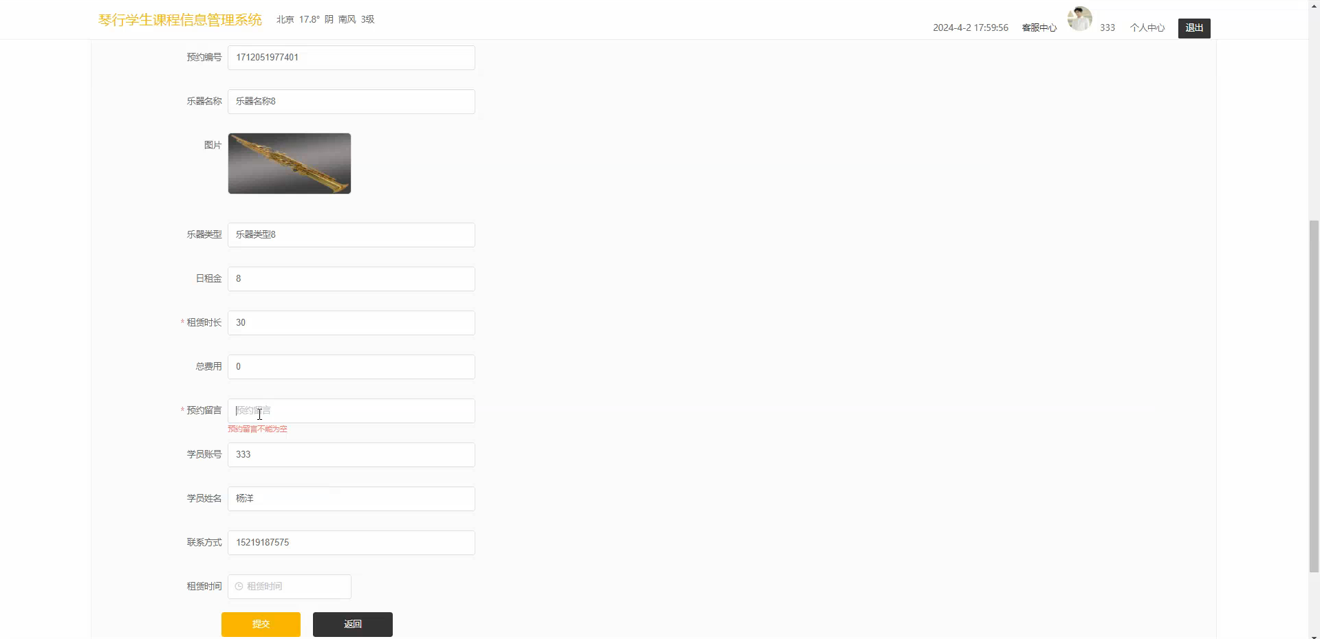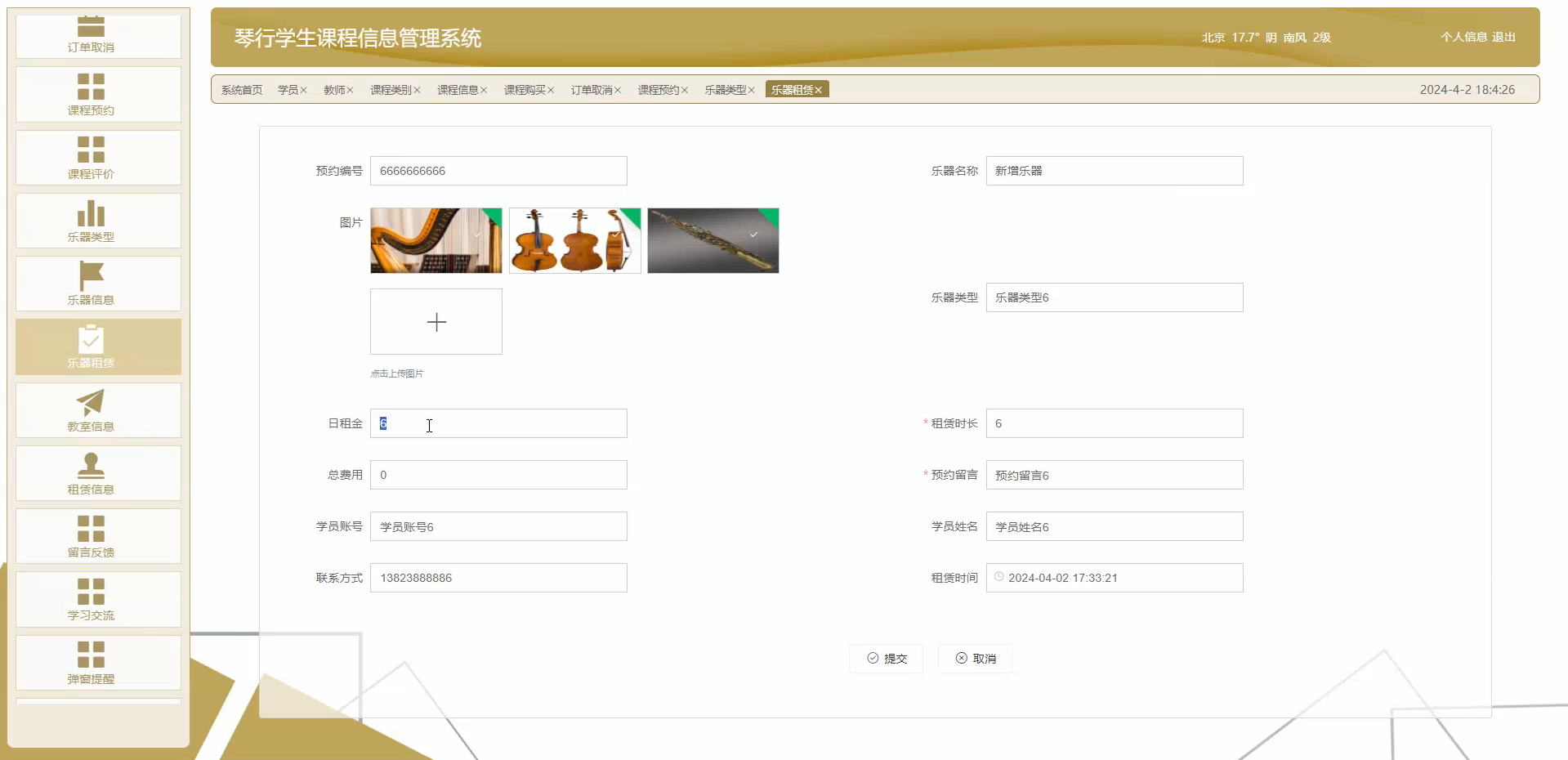 - 功能:管理乐器信息、乐器类型、乐器租赁、教室信息、教室租赁等资源。