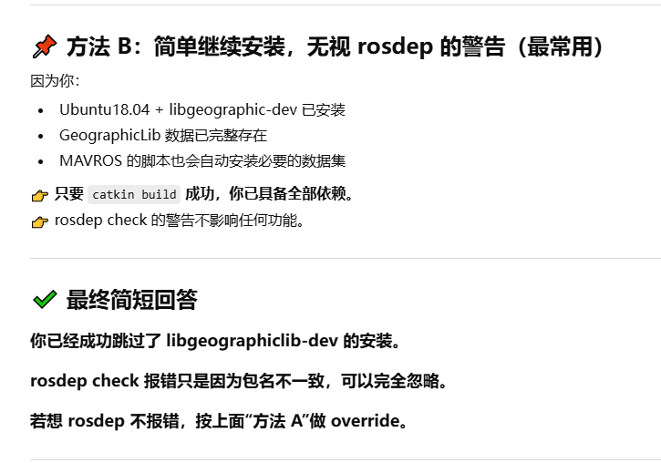 我检查rosdep check --from-paths src --ignore-src,出现下面提示,那么我该如何准备,去跳过 libgeographiclib-dev的安装