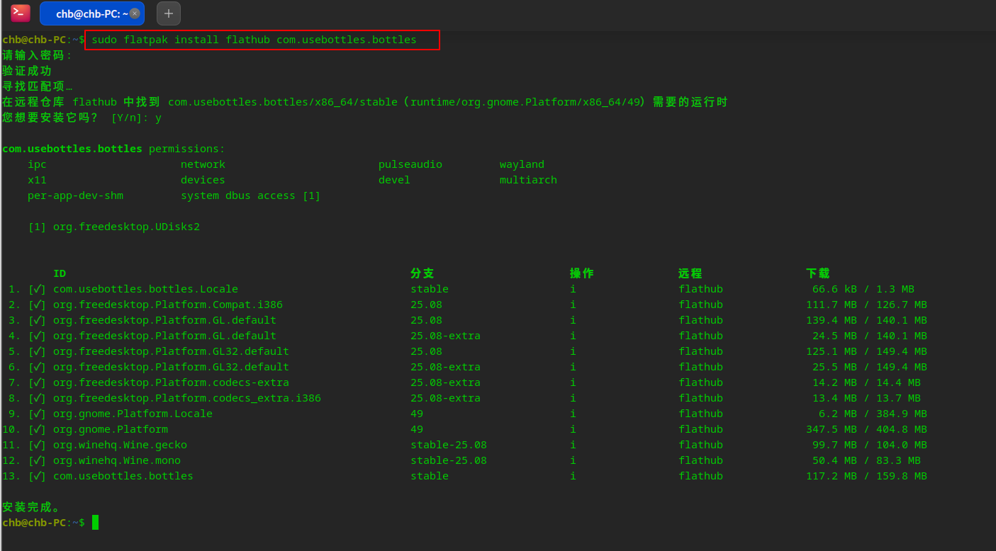 二、使用flatpak安装Bottles并查看已安装应用