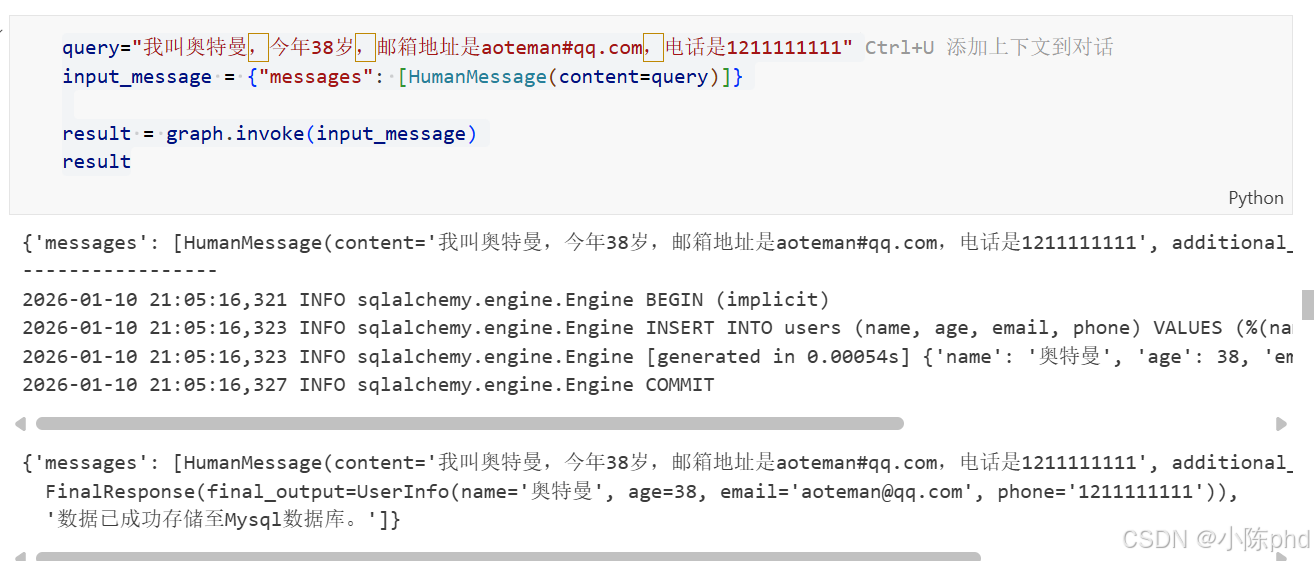 在企业级 AI 应用中,仅能"聊天"的 Agent 远远不够,如何将对话中的关键信息自动识别并精准持久化 到业务数据库,是实现业务闭环的关键。本文将带你通过一个亲测有效的实战案例,掌握利用 LangGraph 的条件边(Conditional Edges)与 SQLAlchemy ORM 框架,构建一个能够自动识别用户信息并将其存储至 MySQL 数据库的智能代理系统。