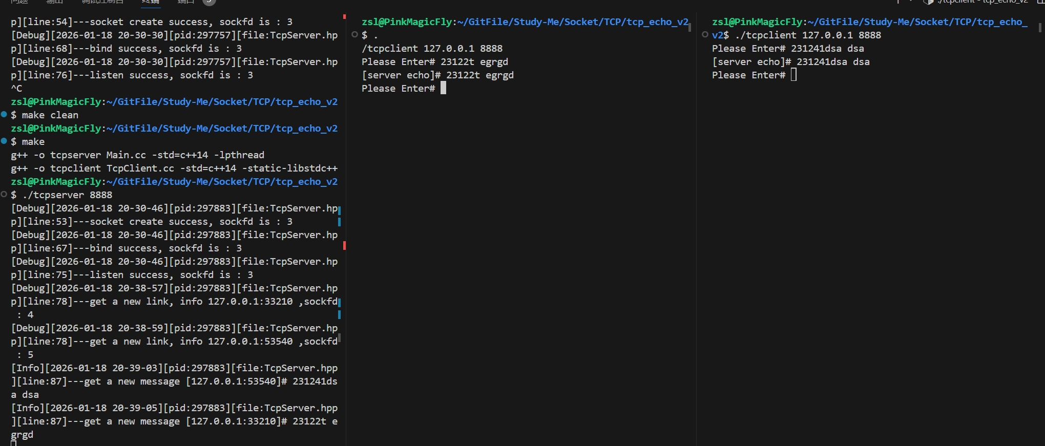 单进程版本同时只能负责一个客户端的通信,其他客户端就算连上了,也要等上个客户端退出连接了才能通信(在这之前发消息只能是延迟返回,比如当轮到他之后,所有反馈一起出现)
