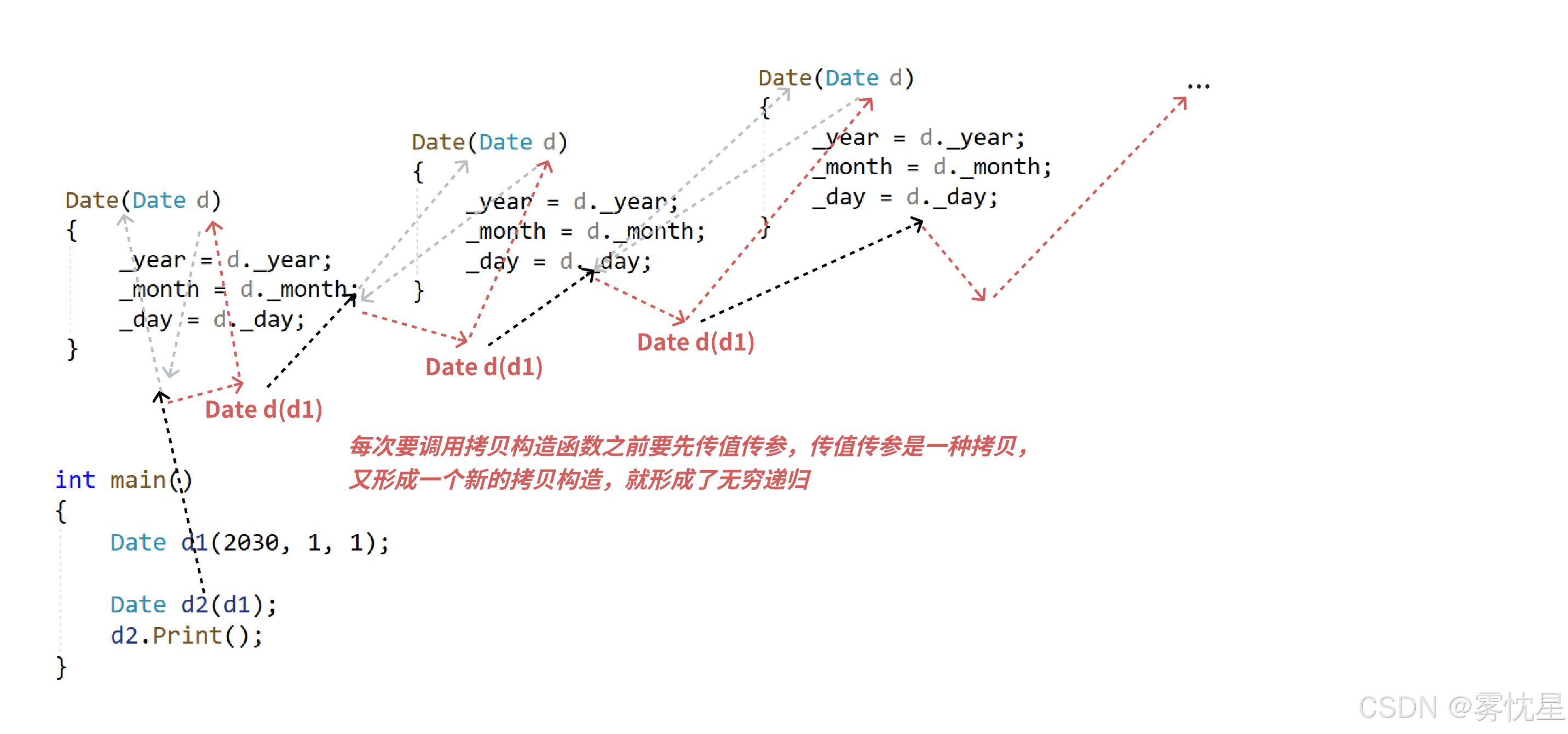 看图也可以明白,当==拷贝构造函数传值传参==时,函数的形参是实参拷贝出来的新对象,要调用拷贝构造,但是拷贝构造函数也是传值传参就又要调用拷贝构造,这样无限循环下去......