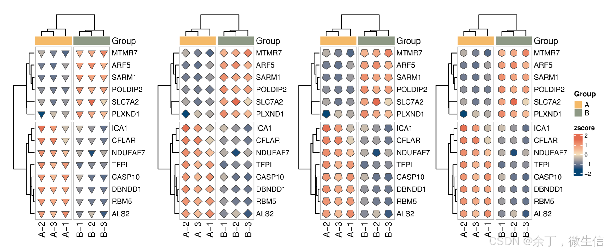 设置了组名字体大小,旋转角度,基因名字体大小,圆点上标注数值的字体大小(默认两位小数)