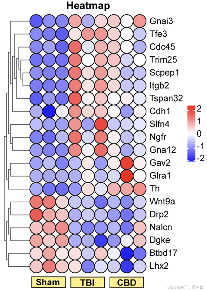 《Phytomedicine》文章Cannabidiol improves cognitive impairment after traumatic brain injury by attenuating neuronal oxidative stress and apoptosis via the SET/PP2A/Akt signaling axis. Fig 2A的圆点热图展示了三组间差异基因的表达情况,红色表示表达相对较高,蓝色表示表达相对较低。此图不是以常规的小矩形展示热图,而是使用圆点来展示,星罗棋布,令人耳目一新。