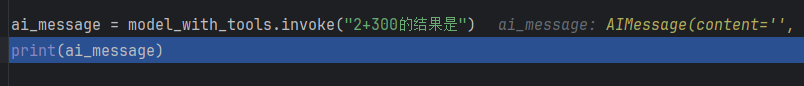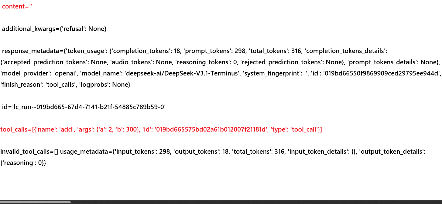 不要关心别的地方,就看我标红的地方。首先我们前面不是说了模仿大模型调用工具的姿势才能看到内容吗,注意看这里的tool_calls,说明经过大模型判断它主动根据我们的问题调用了我们提供的工具。但是我们不想让它只是这种形式给我们返回啊,我们想要的是LLM根据工具的调用结果进行总结然后告诉我们比如2加300的结果是302这样的回答。