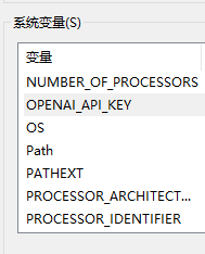 在系统环境变量中新建一个名为OPENAI_API_KEY的环境变量,然后内容填入你上面创建的Key即可:
