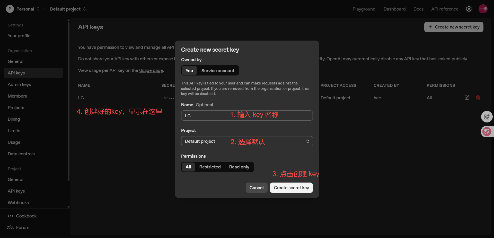 将 API Key 在⾃⼰本地保存好,后续接⼊ ChatGPT 时需要使⽤。
