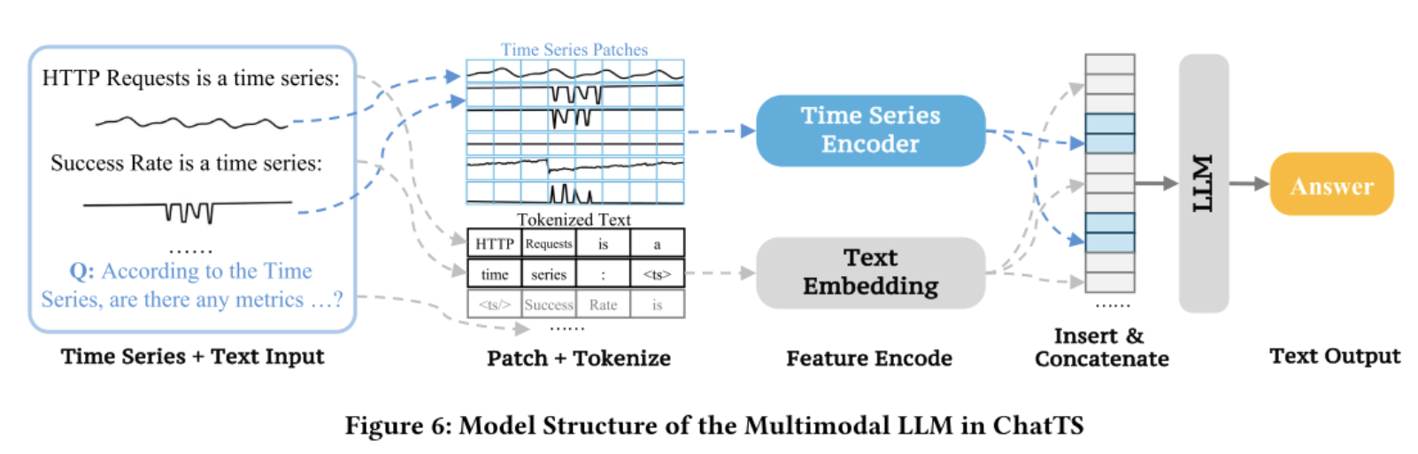 TimeSeriesEmbedding(MLP结构) 将时间序列切片(Patch)并映射到 LLM 的特征空间(Embedding Space)。 - 融合机制 (Fusion): 在输入层(Input Embedding layer)直接将文本的 Embedding 和时间序列的 Embedding 拼接在一起。