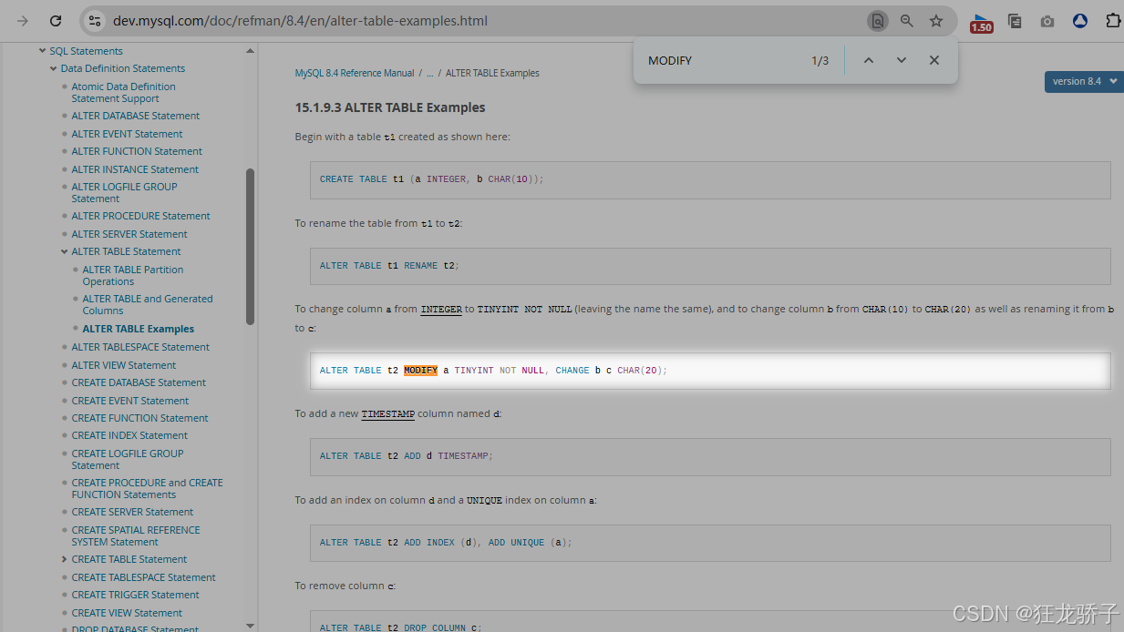 官方关于ALTER TABLE语句的用法举例,供参考。