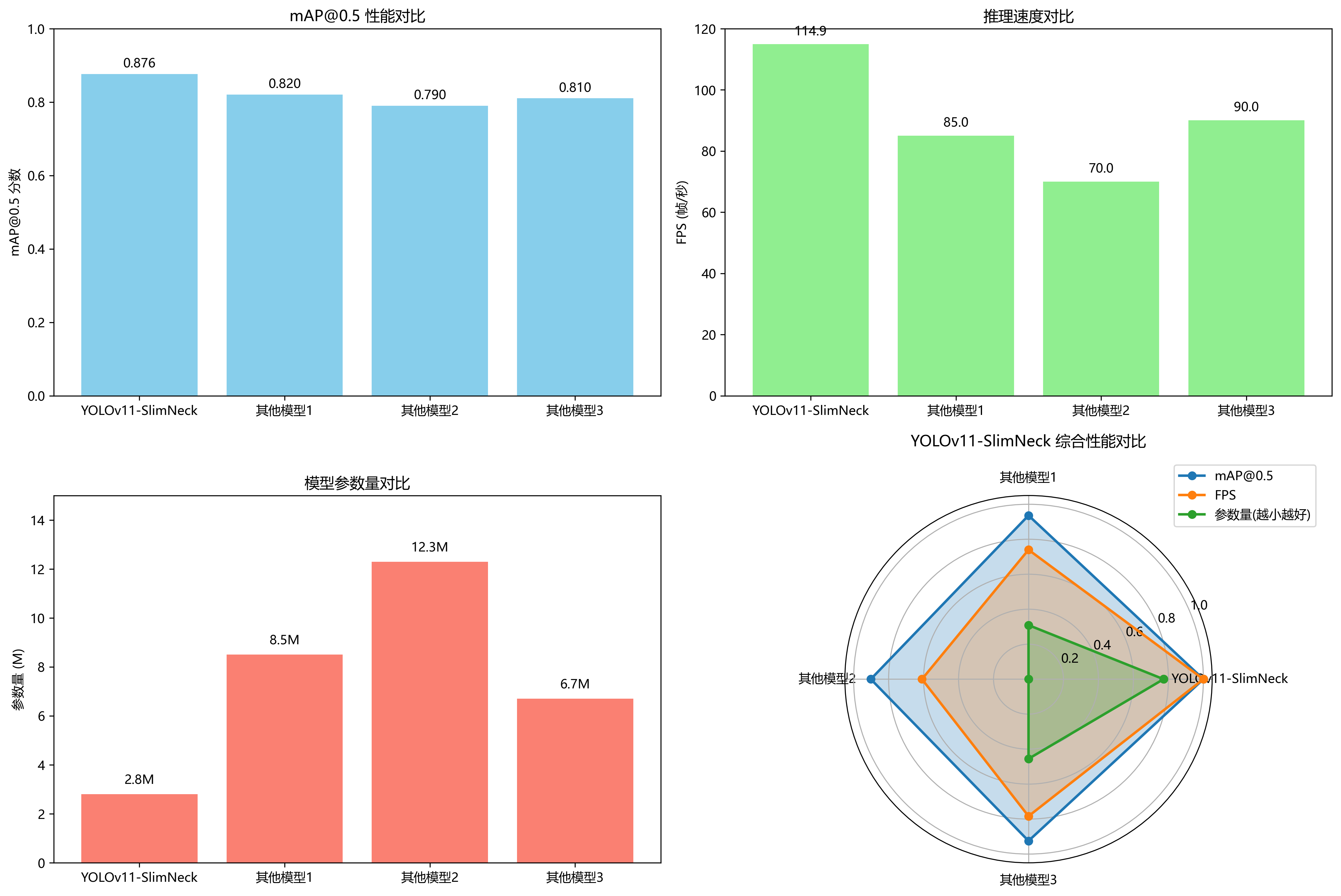 从表中可以看出,我们的YOLO11-SlimNeck模型在mAP指标上相比原始YOLOv11提高了2.3个百分点,同时FPS提高了约35%,模型大小减少了约47%。这表明我们的改进在保持高精度的同时,显著提升了模型的轻量化程度和推理速度。