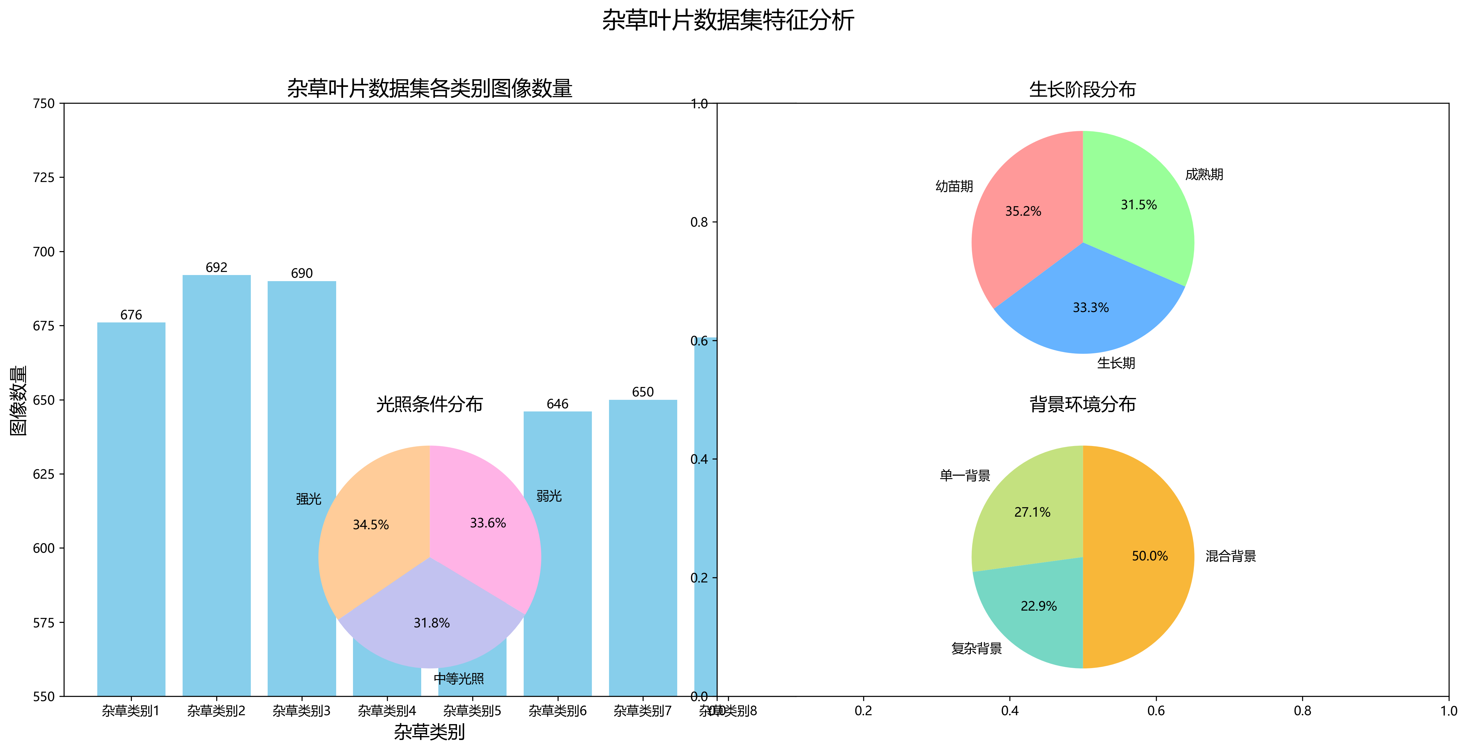 3学习模型成功的关键。针对杂草叶片识别任务,我们构建了一个包含10种常见杂草叶片的数据集,每种杂草约500-800张图像,总计约6500张图像。数据采集来自不同生长阶段、不同光照条件和不同背景环境下的杂草叶片图像。