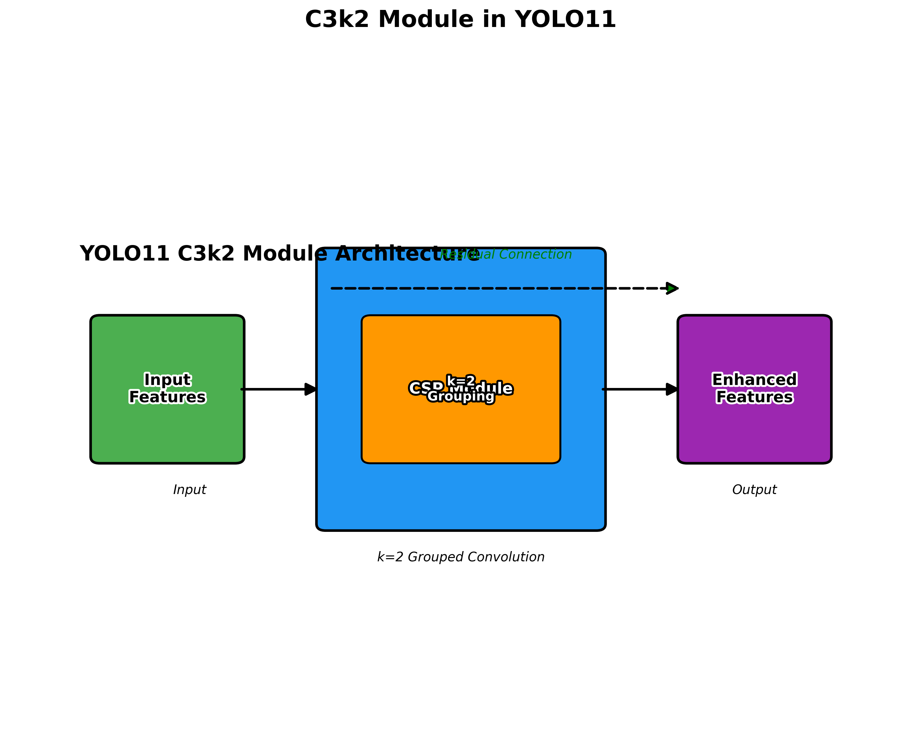 C3k2是YOLO11中的核心模块之一,它是一种改进的CSP模块,通过引入k分组卷积和残差连接,有效提升了特征提取能力。