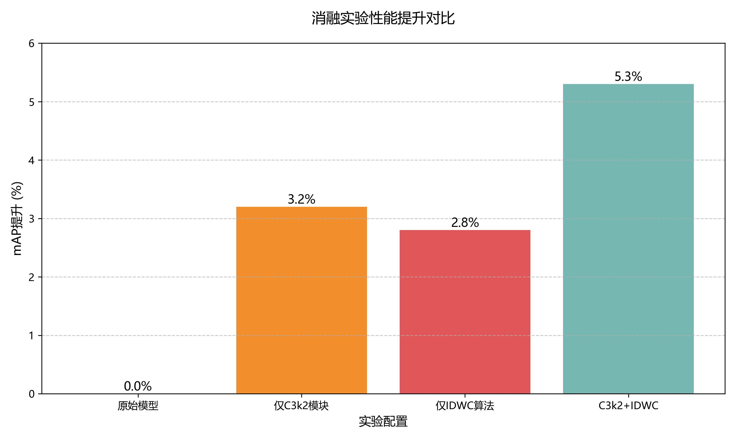 消融实验进一步验证了C3k2模块和IDWC算法的有效性。实验数据显示,单独引入C3k2模块可使mAP提升3.2%,单独引入IDWC算法可使mAP提升2.8%,而两者结合使用则实现了5.3%的综合提升,证明了模块之间的协同效应。🔬 这表明我们的改进设计不是简单的模块堆砌,而是各模块间相互促进、共同提升的整体优化。