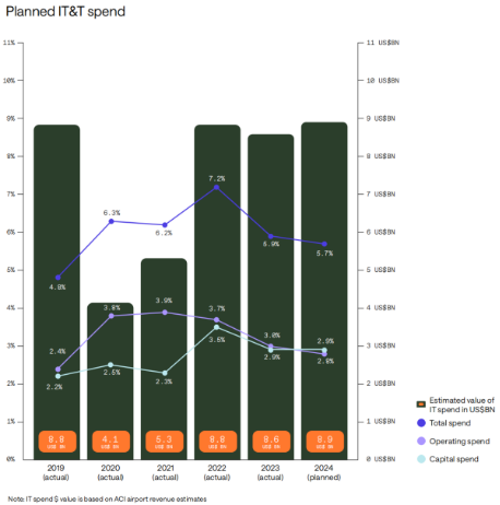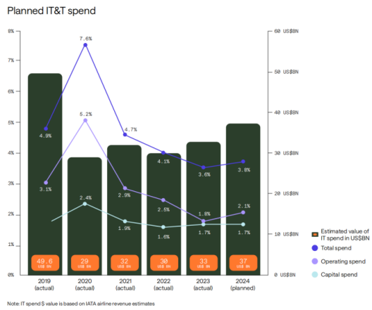 根据SITA(国际航空电讯集团)发布的《SITA 2024航空运输IT洞察报告》(SITA 2024 Air Transport IT Insights),2024年,由于客流量增长的推动,航空业的收入创下了历史新高。随着数字化势头的持续增长,IT支出上升到了2019年以来的最高绝对水平。2024年,航空业整体IT支出达到370亿美元,72%的受访者将在2025年提高IT支出,且大部分优先投资网络安全领域。