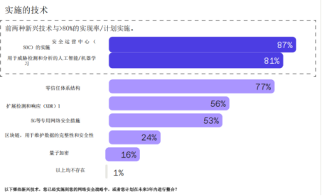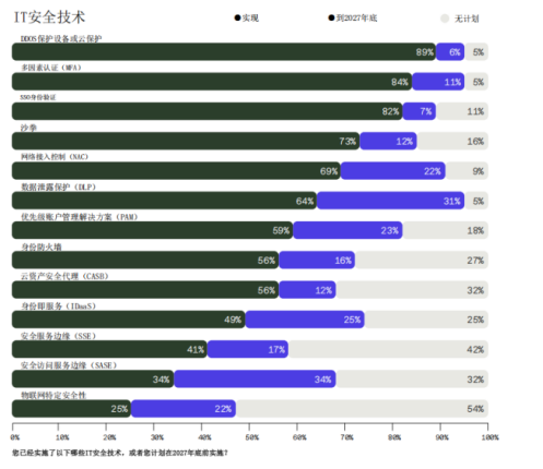 其中,实施最广泛的"IT安全技术"主要集中于妥善管理现有的网络安全系统。