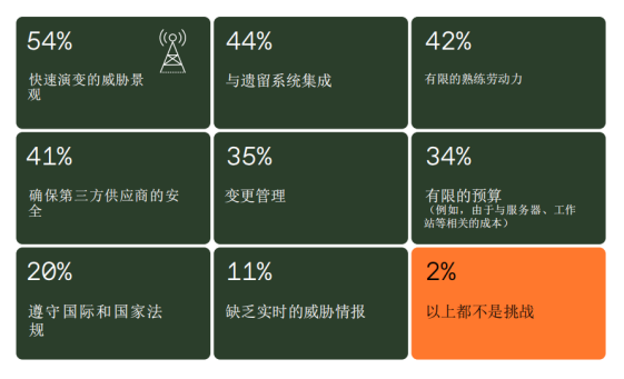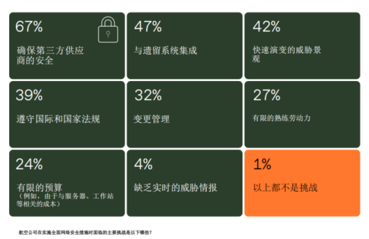 在当今数字化时代,航空网络安全面临着前所未有的复杂挑战,其威胁形态日益多元化,对航空公司的运营安全、乘客隐私保护以及整个航空业的稳定发展构成了严峻考验。SITA报告显示航空公司在引入网络安全时面临的最大挑战是"确保第三方供应商的安全",第三方供应商可能很可能会成为希望利用供应链漏洞的网络犯罪分子的目标,而机场面临的最常见挑战是"快速发展的威胁景观"(54%),比如网络钓鱼攻击和数据泄露。
