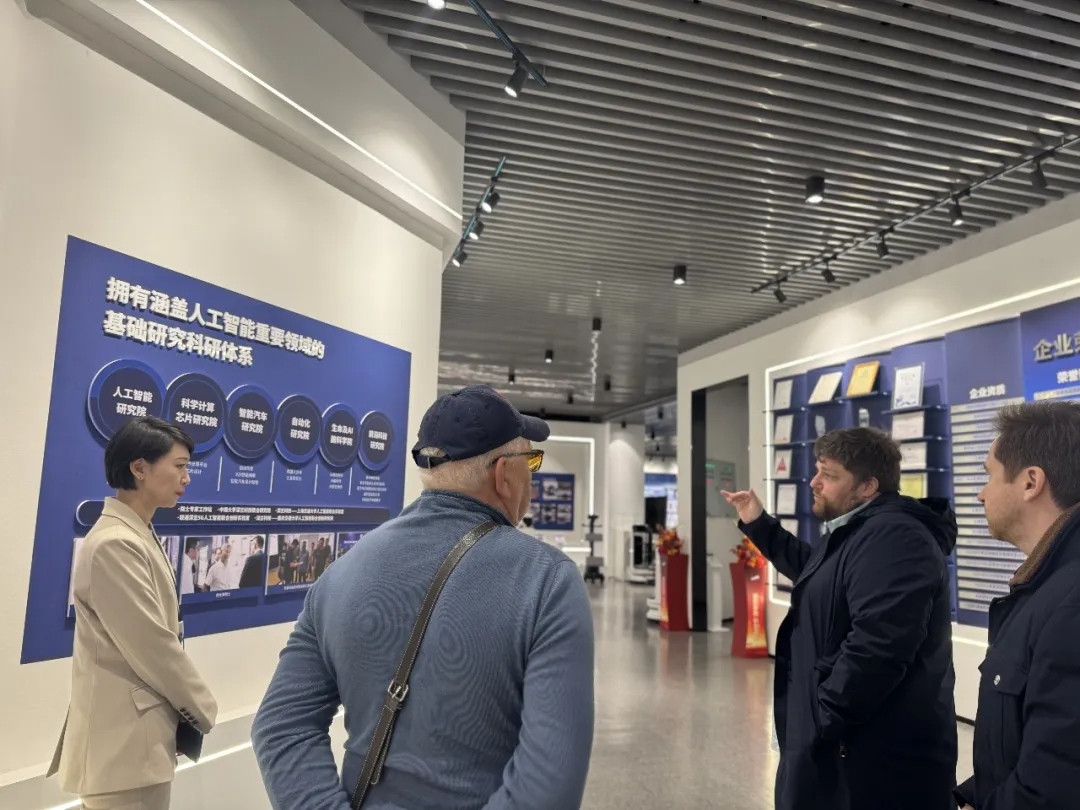 在深兰科技团队的引导下,代表团参观了企业展厅,系统了解公司围绕"基础算法---视觉大模型---具身智能---群体智能---智能装备"构建的全栈人工智能技术体系。