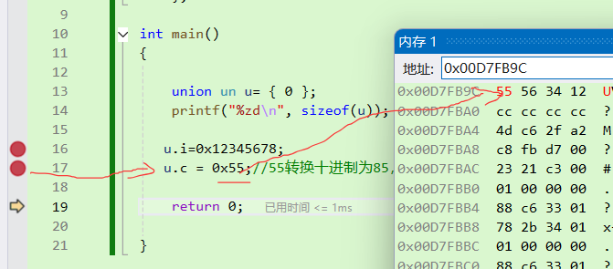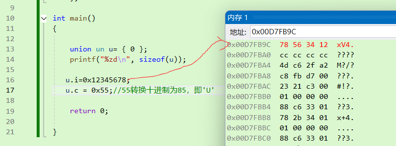 u.c = 0x55;//55转换十进制为85,即'U'