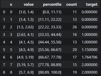 pd.DataFrame,里面是"每个分桶的统计汇总"(比如各桶的样本量、各类别/目标的聚合统计等)