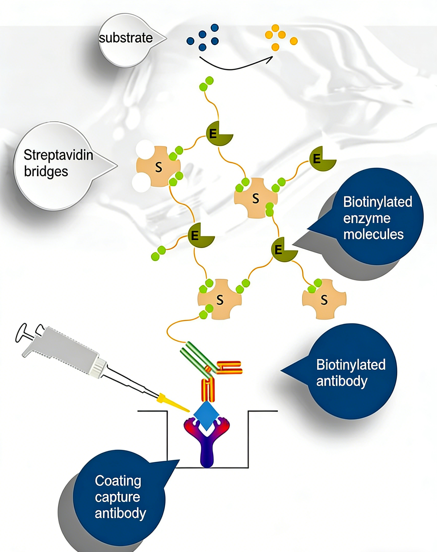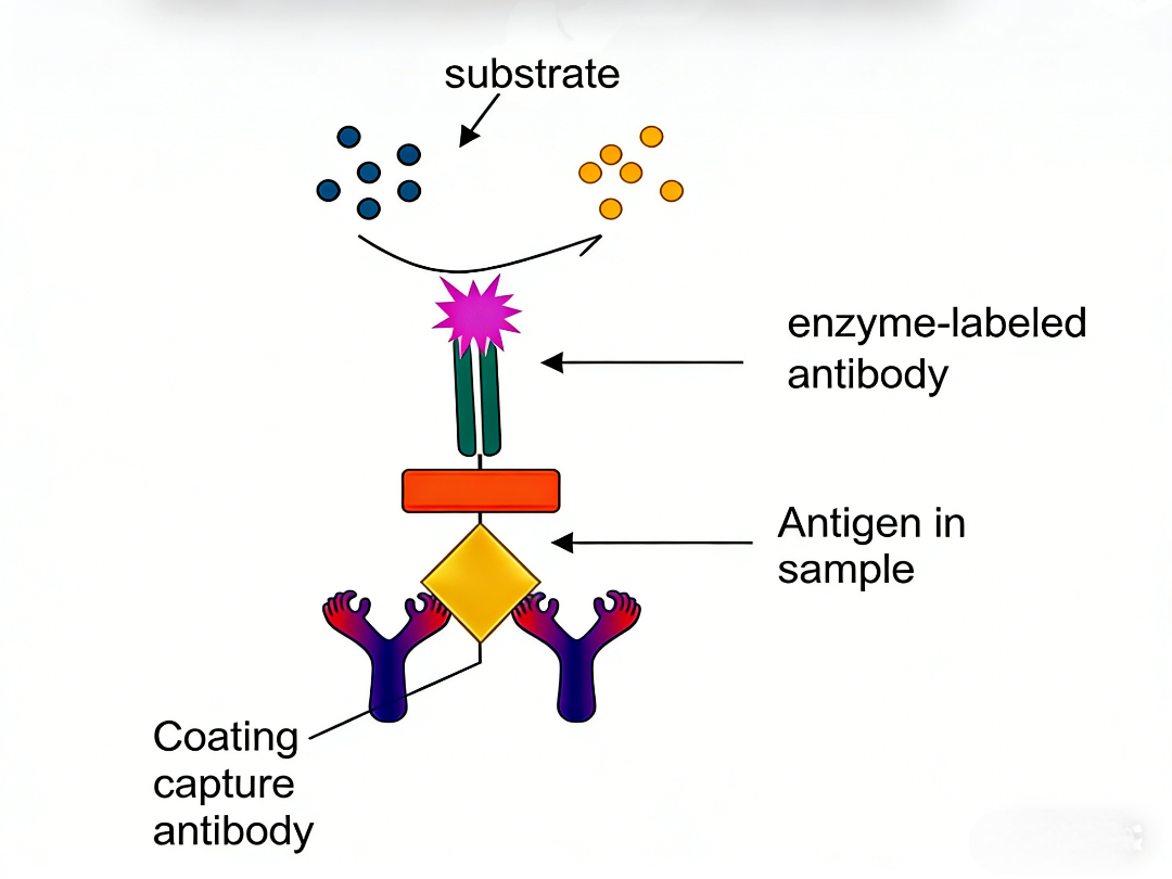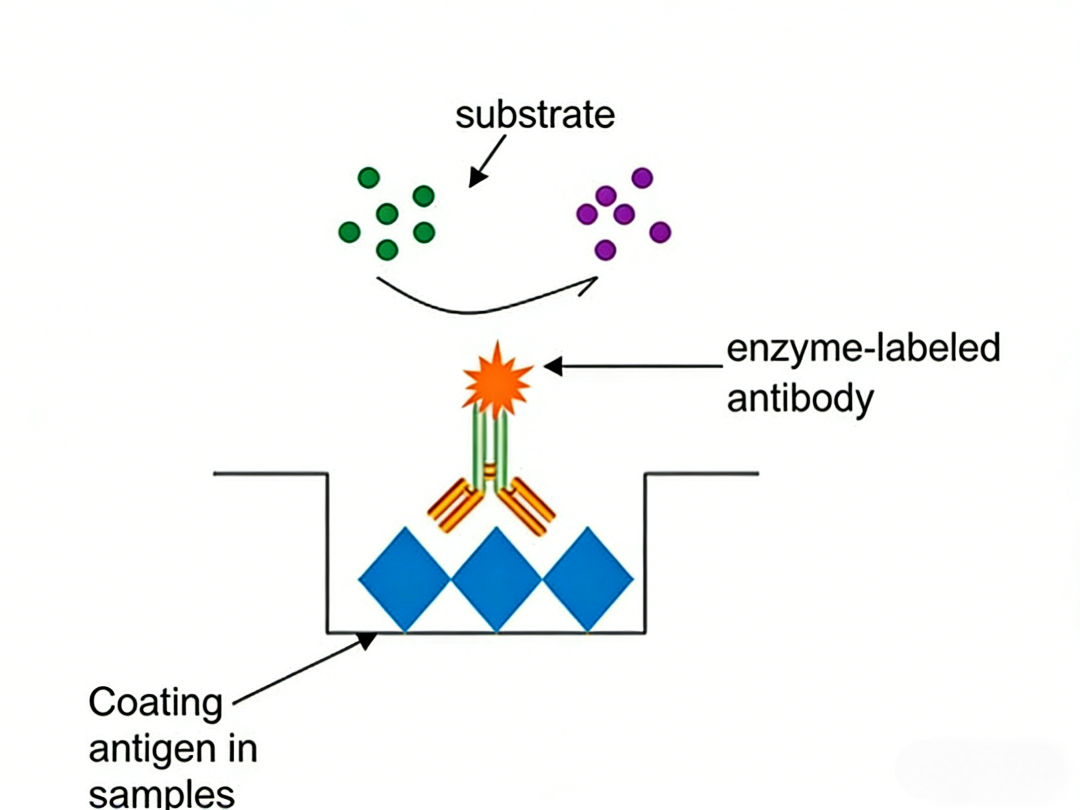 4.信号检测: 加入酶特异性底物溶液,通过酶催化反应生成有色产物,测定吸光度值以实现目标分析物的定量或定性检测。
