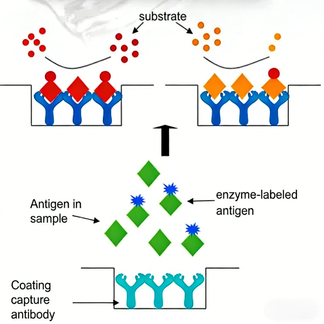 原理: 待测抗原与酶标抗原竞争结合固相上的有限抗体位点,通过检测信号抑制程度定量分析物。