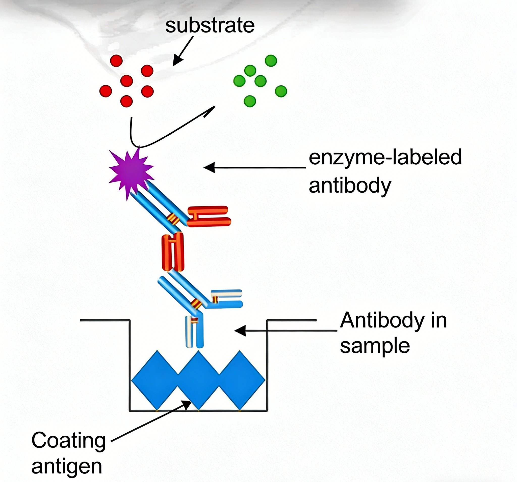 1.固相包被: 将具有免疫活性的已知抗体或抗原通过物理吸附或共价交联方式固定于固相载体(如聚苯乙烯微孔板)表面。
