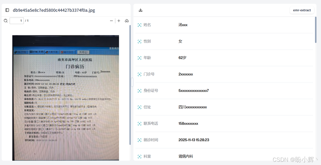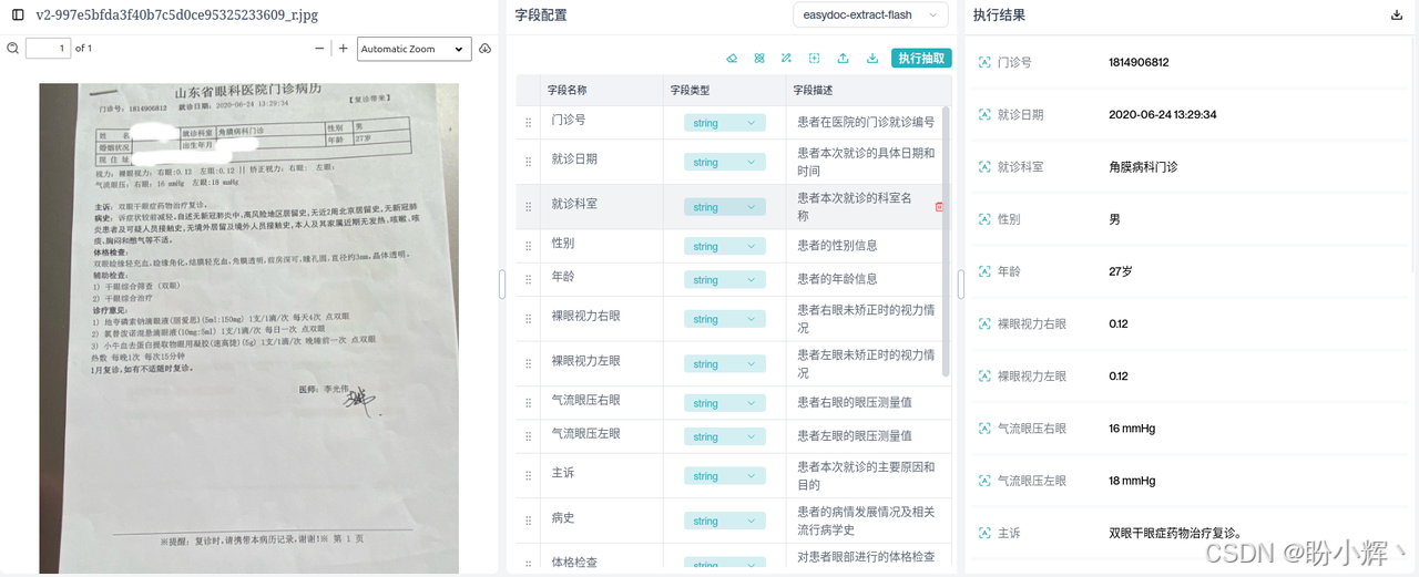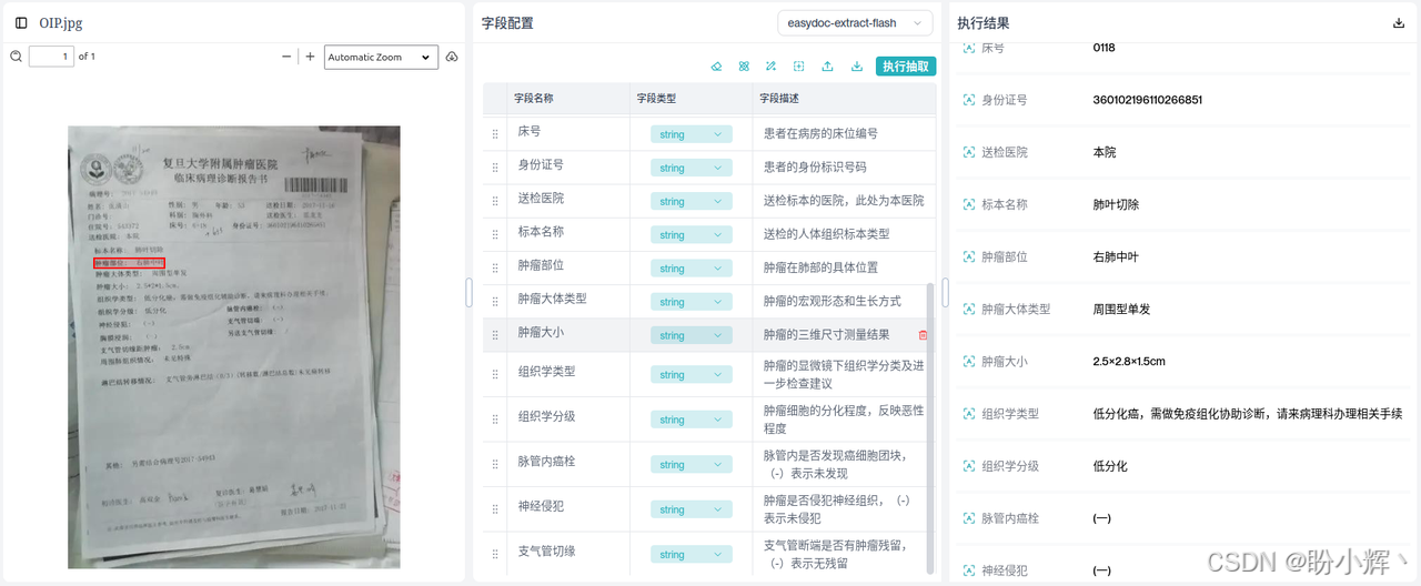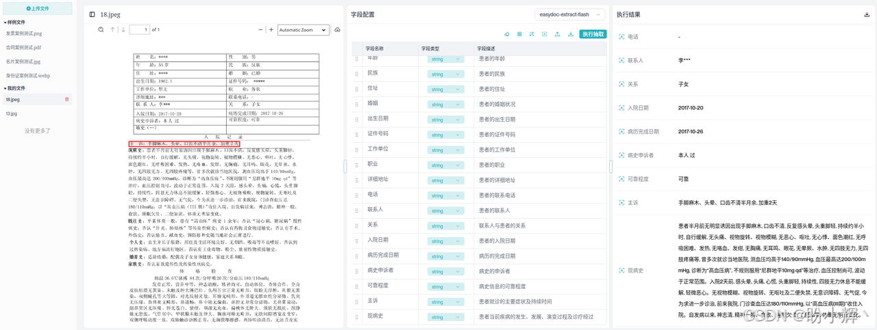 EasyDoc 智能抽取展现出卓越的性能表现,成功实现了从"文档处理"到"临床知识提取"的能力跃迁,能够为医疗机构提供了真正可用的智能化工具。以下图为例,可以看到 EasyDoc 智能抽取成功实现了从"文档处理"到"临床知识提取"的能力跃迁,精准识别并结构化核心临床信息,为医疗机构提供了真正可用的智能化工具。