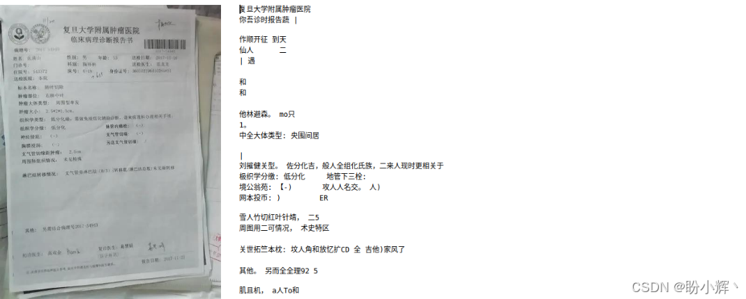 相较于 PDF 检测报告,传统 OCR 在低质量扫描病历中表现更加糟糕,不仅出现了大量的错误文字识别,同时出现了丢失位置坐标信息的情况,导致信息跨行错乱。