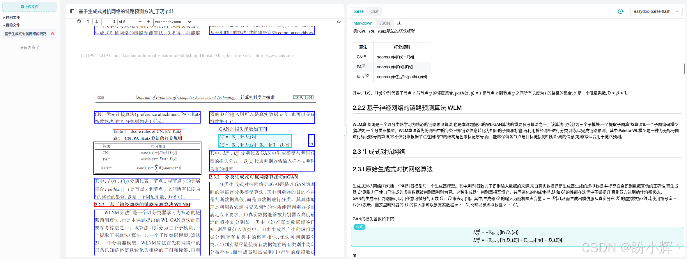 EasyDoc 智能解析支持 PDF、DOCX、PPT、JPG、PNG 等主流格式的直接解析,无需格式转换。首先测试 PDF 论文文档,可以看到 EasyDoc 能够自动提取学术论文中的标题、作者、摘要、关键词、研究方法、核心结论、公式、表格及参考文献等结构化信息。
