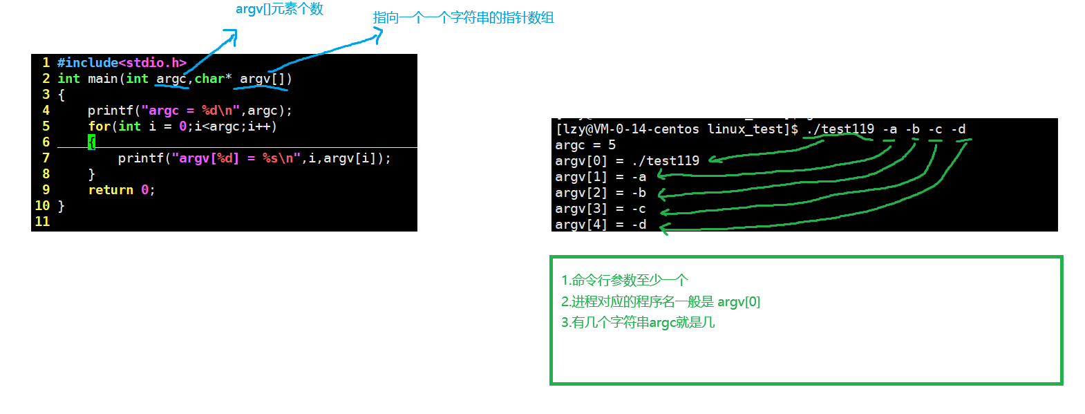 父进程中有两张表,一张环境变量表(比较稳定),一张命令行参数表(一直在变)