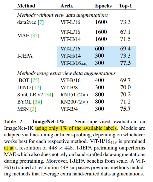 I-JEPA 在semantic tasks 上和view-invariant pretraining 方法具有竞争力,在low-level task上 如目标计数和深度估计则更强;