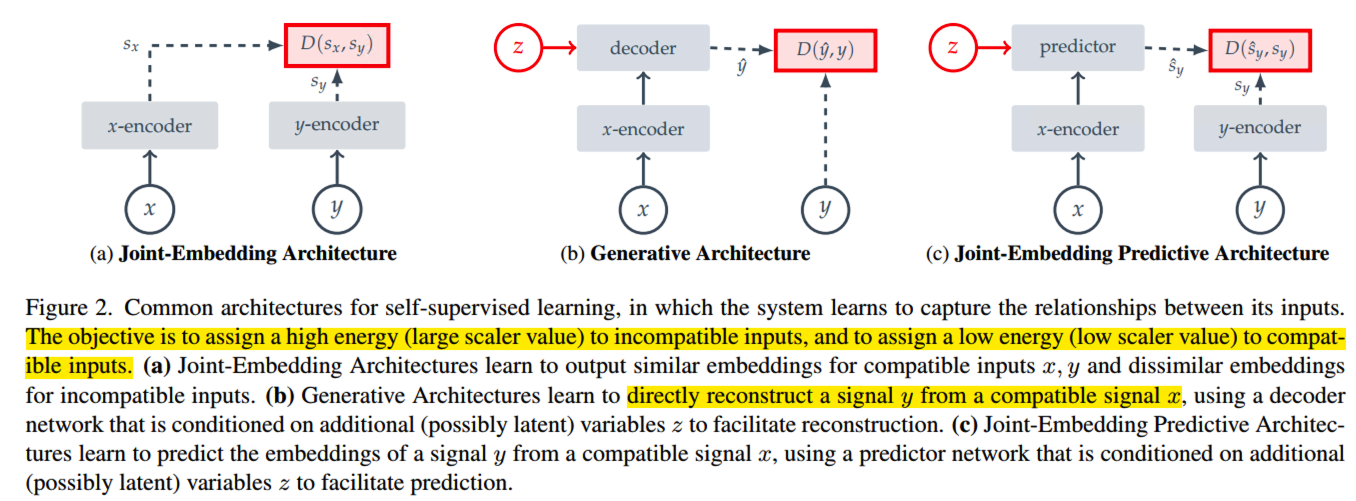 1.Joint-Embedding Architecture 对于compatible inputs 输出相似的embedding,对于incompatible inputs 输出dissimilar embedding,这种dissimilar 被称为 高能量状态,Energy- based model: EBMs; 这里的compatible 在图像中是指随机施加图像增强方法得到的样本;JEA 面临的问题是representation collapse:编码器不管输入什么都输出constant content;过去解决representation collapse 的方法有对比学习,最小化信息redundancy,以及聚类的方法来最大化average- based embedding 的 entropy;以及启发式的方法,对x-encoder和y-encoder采用非对称结构;