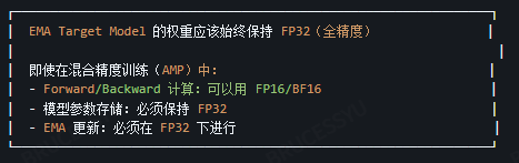 采用混合精度训练的情况下,EMA模型也是在FP32下进行的;