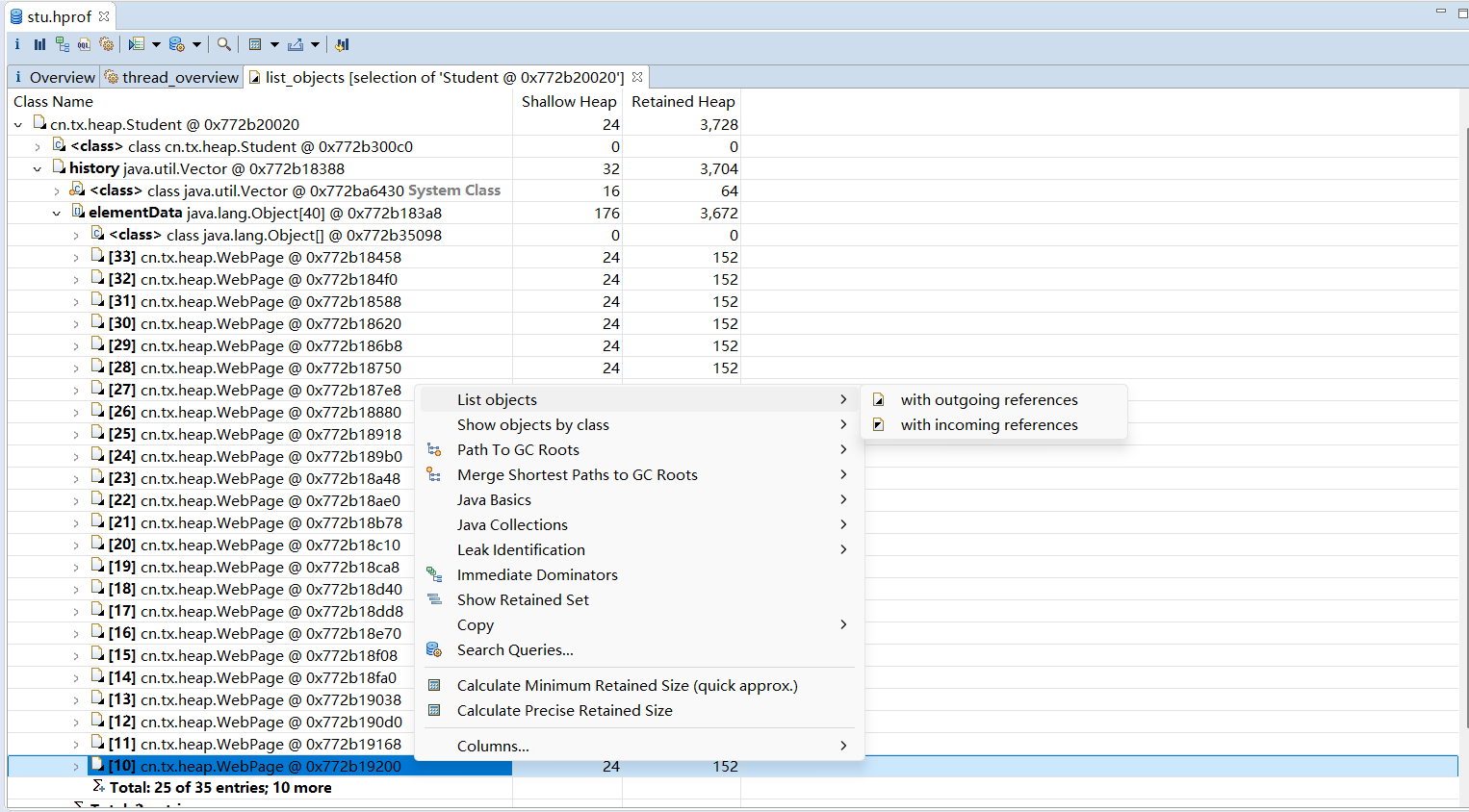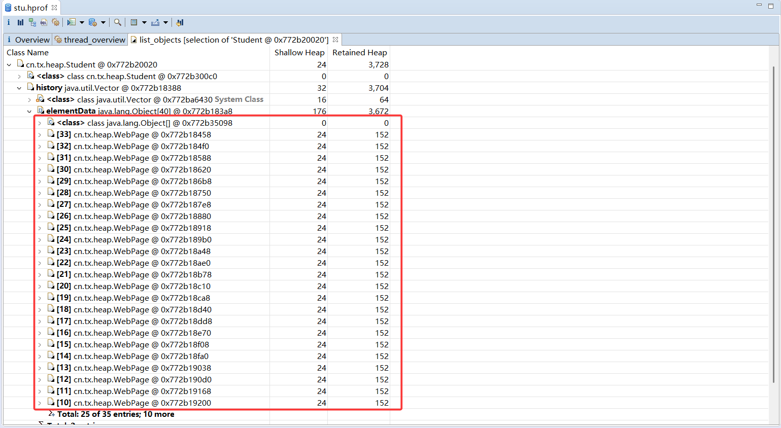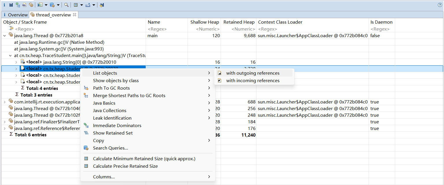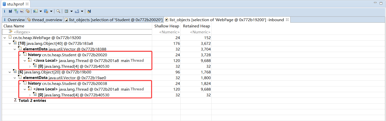 使用MAT打开产生的stu.hrof文件。在线程视图中可以通过主线程,找到3名学生的引用,如图所示,这里已经标出了每个实例的学生名。除了对象名称外,MAT还给出了浅堆大小和深堆大小。可以看到,所有Student 类的浅堆统一为24 字节,和它们持有的内容无关,而深堆大小各不相同,这和每名学生访问的网页有关。