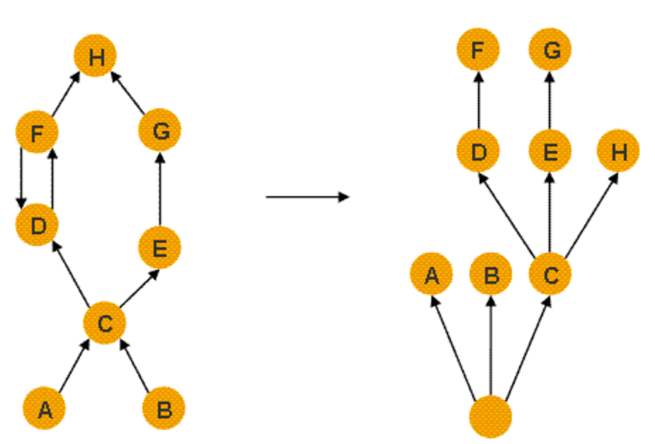 支配树是基于对象间的引用图所建立的,如图所示,左图表示对象引用图,右图表示左图所对应的支配树。