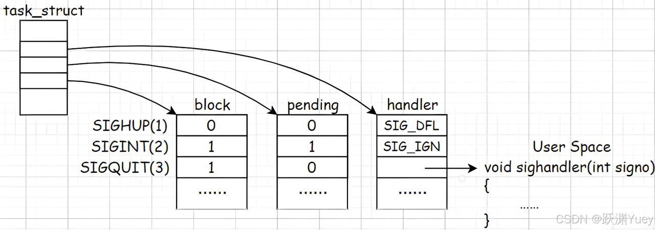 pending表可以看作是unsigned int pending的位图,比特位的位置表示收到第几个信号,比特位的数值表示是否接收到信号;block表可以看作是unsigned int block的位图,比特位的位置表示收到第几个信号,比特位的数值表示是否阻塞该信号。因此这个信号是否要被处理要进行pending & (~block)。而handler表是一个函数指针数组,里面存贮的是数组下标对应信号的默认处理动作,我们的signal函数进行自定义处理动作其实就是根据信号编号作为索引来修改的这一个函数指针数组。