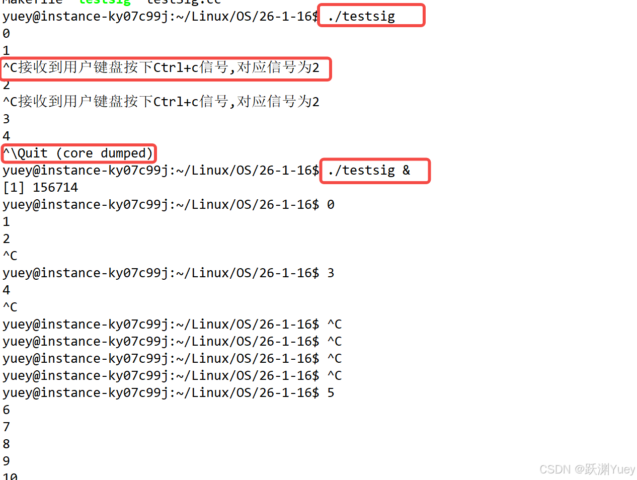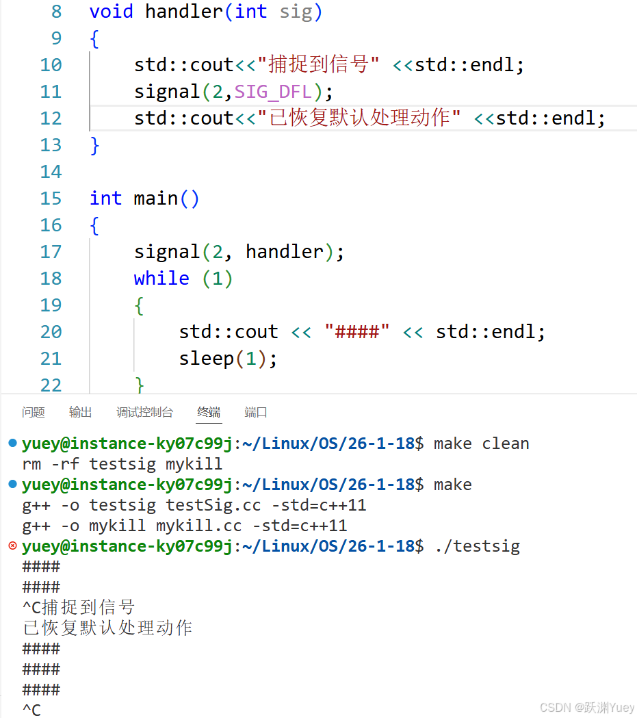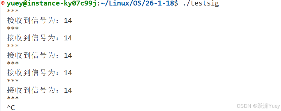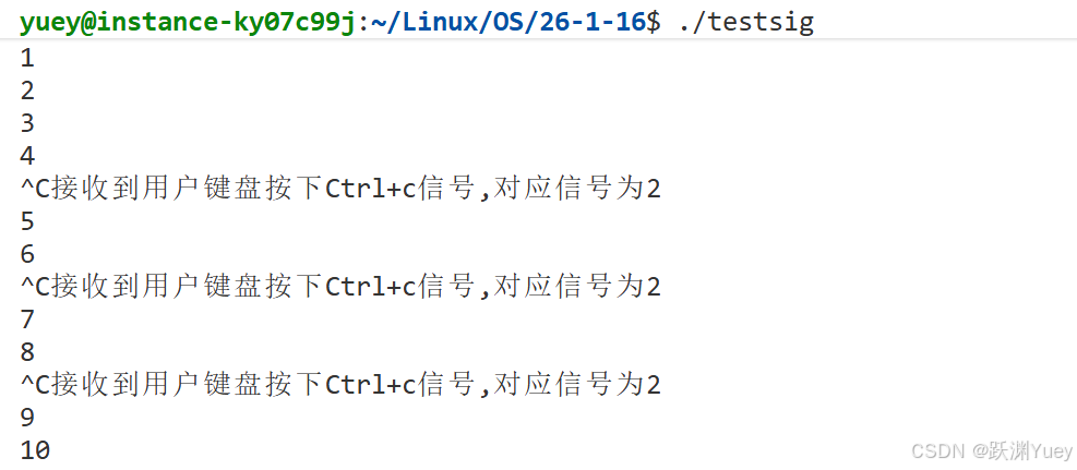 可以看到在用户按下Ctrl+c后,进程并没有终止,反而去执行了我们自定义的函数,因此可以证明Ctrl+c就是2号SIGINT信号,以及进程对于大多数信号的默认处理动作就是结束自身进程。