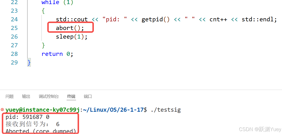 abort是向进程发送6号信号,可以被自定义捕捉,但当执行完自定义动作之后,进程必须被结束掉。