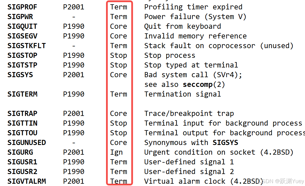 进程对于信号的默认处理方式在文档中可以看到有Term、Core终止以及Stop和Ign忽略这几种,对于大部分的信号处理方式是终止。