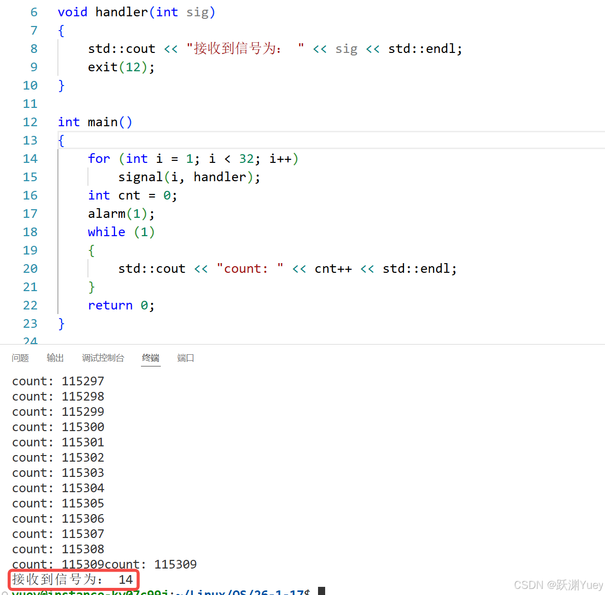 那如何证明ctrl+c就是2号信号以及信号的默认处理动作是终止信号呢?我们可以修改进程对信号的默认处理动作,使用sighandler_t signal(int signum, sighandler_t handler);这一系统调用用于捕捉信号来修改进程对信号的默认处理动作。