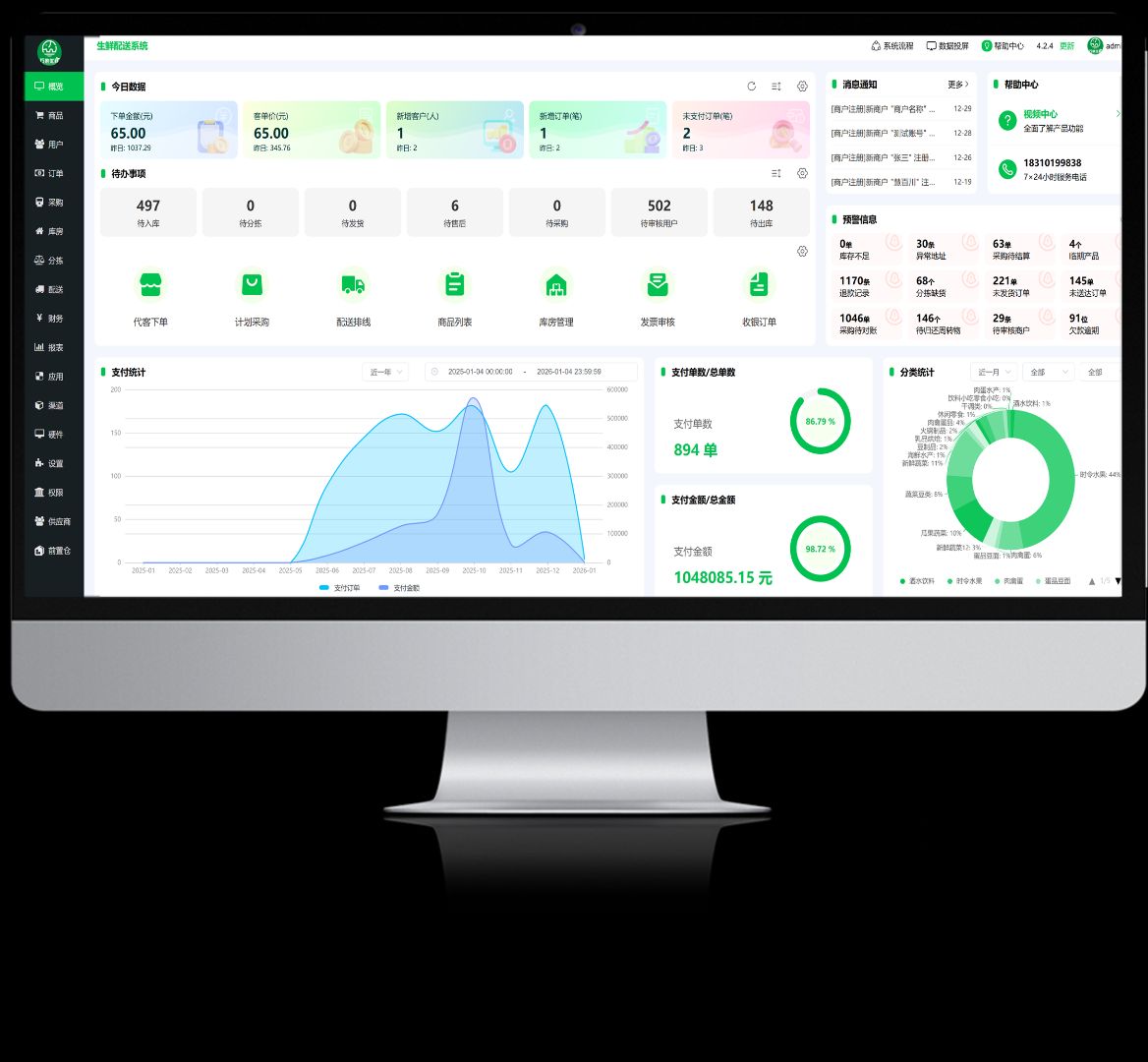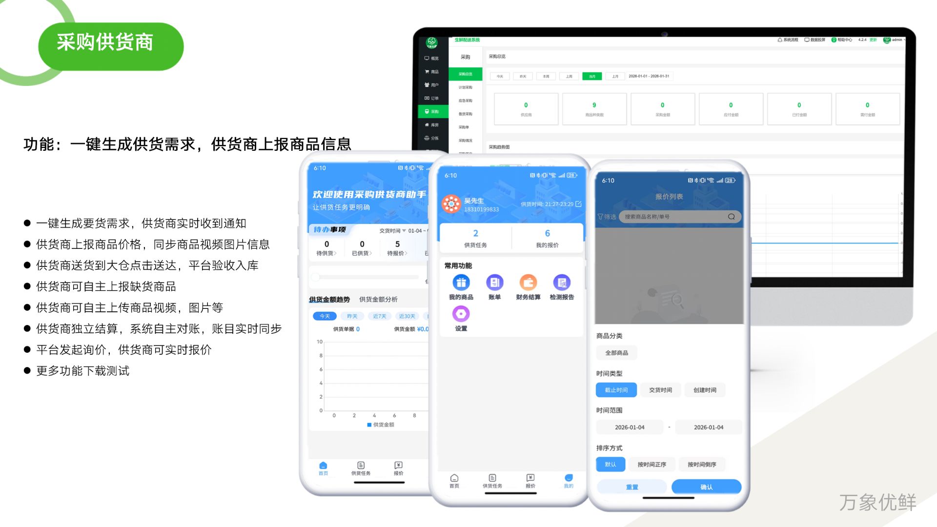 蔬菜配送行业的竞争已进入精细化运营时代,万象生鲜系统既全面覆盖餐饮店、学校政府单位、个人家庭等多场景配送需求,又通过①小程序订货商城、②智能分拣打印功能、③采购进货仓库功能、④司机配送和财务管理、⑤零售门店收银功能、⑥业务员业绩管理系统、⑦测试体验后台功能七大核心模块,实现全链路赋能。无论是破解高峰订单压力、保障蔬菜新鲜度,还是满足B端客户合规需求、适配C端客户灵活下单,亦或是优化团队管理、降低运营成本,万象生鲜系统都能提供精准解决方案,成为蔬菜配送企业数字化转型的优选伙伴,助力企业在激烈市场竞争中实现可持续发展。