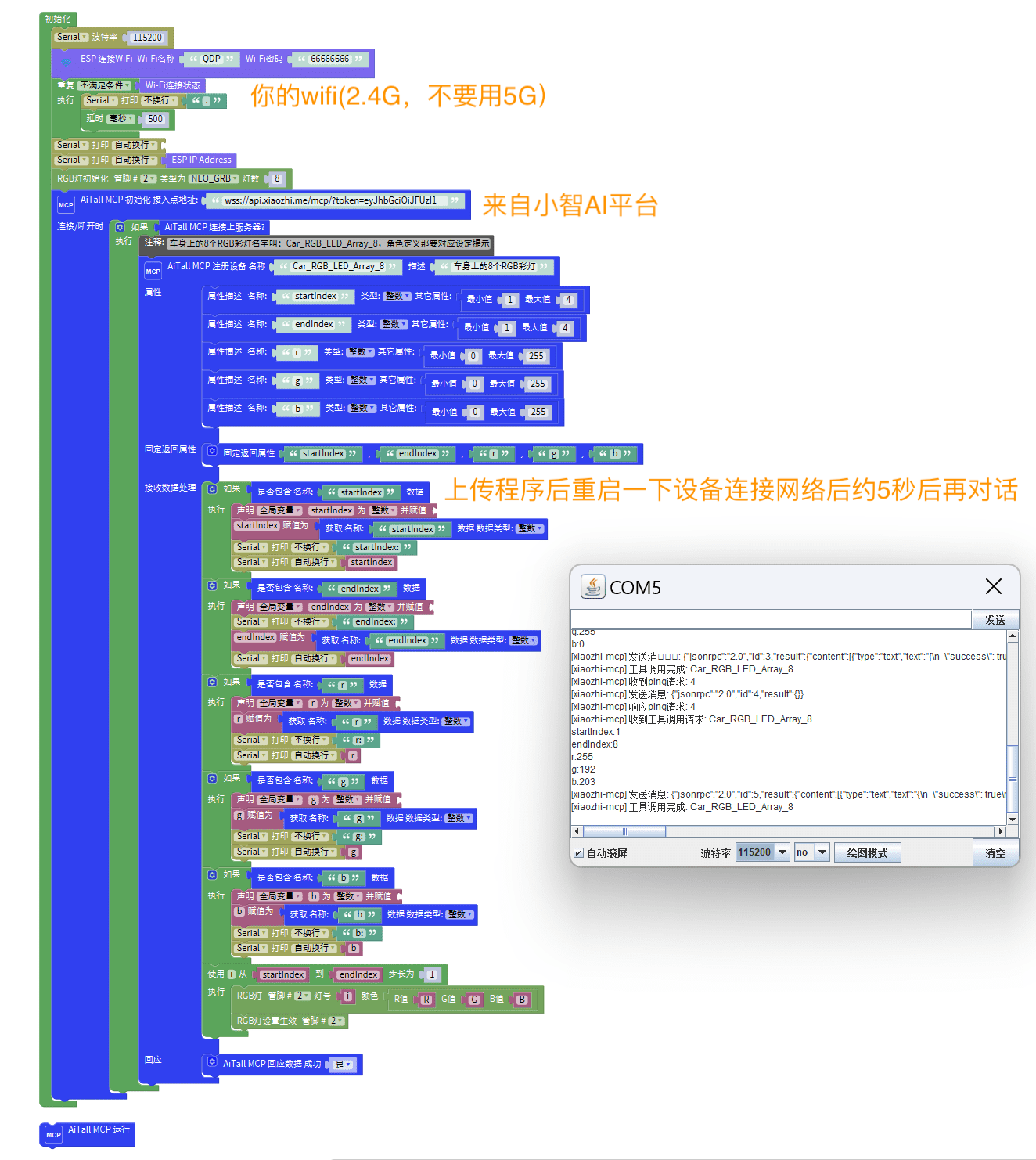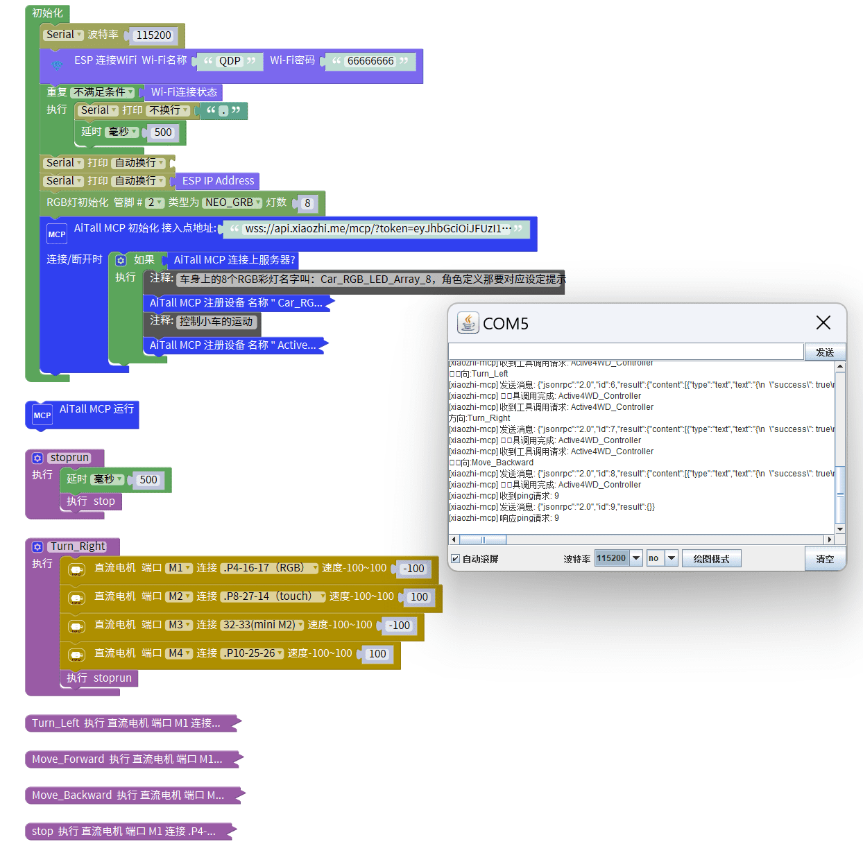 1.语音/文本指令输入:用户通过自然语言与小智AI对话; 2.大模型意图解析:利用小智AI开源大模型理解用户指令语义; 3.多协议融合通信:通过串口、MQTT、MCP协议及本地IoT控制(如AiTall内置RGB灯反馈),构建低延迟、高可靠的人---AI---小车通信链路; 4.智能行为执行:小车根据AI解析结果完成移动、灯光响应、状态反馈等具身动作; 5.可视化编程体验:采用齐护教育版Mixly平台,零代码门槛快速上手,兼顾教育友好性与工程扩展性。