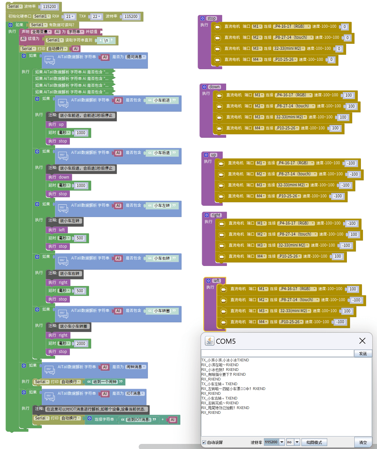 程序功能说明:当你跟他的对话中,有检索到设置的对应词时,小车就会做出对应的动作响应,比如:小车左转,小车右转,要能完全对上的词,包括你说的一句话中只要包含这个词就可以。。