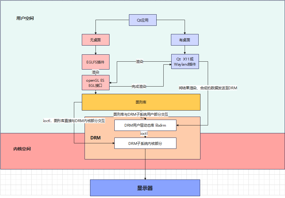 - 对接 DRM 完成显示输出:合成完成后,通过 libdrm 库调用 DRM 内核子系统的「页翻转」接口,将最终帧数据提交到显示面板,完成界面输出。